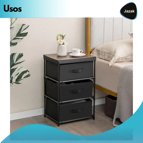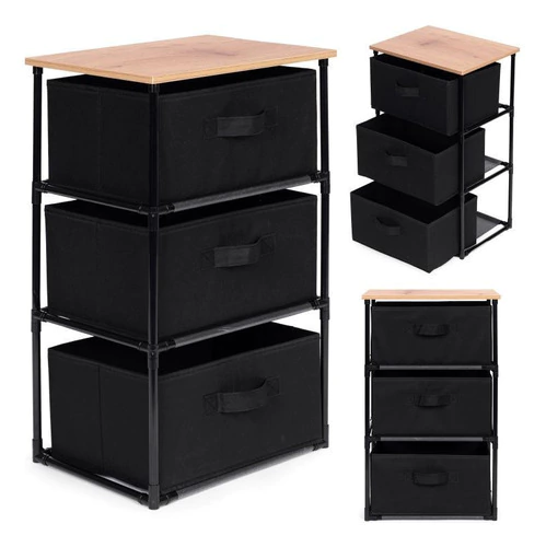 Organizador JAZAK de 3 Cajones de Tela con Estructura Metálica y Tapa de Madera - Estilo Industrial ¡Mantén tu hogar organizado con estilo con este práctico organizador de 3 cajones! Su diseño moderno y funcional lo convierte en la solución perfecta para cualquier espacio. Características Principales: 3 Cajones de Tela Resistente: Amplios y espaciosos, ideales para guardar ropa, accesorios, juguetes, o cualquier objeto que necesites tener a mano. Estructura Metálica Robusta: Garantiza estabilidad y durabilidad, soportando el peso de tus pertenencias sin problemas. Tapa Superior de Madera: Aporta un toque cálido y natural, convirtiéndola en una superficie adicional para colocar objetos decorativos o de uso diario. Diseño Industrial: La combinación de metal y madera le da un aspecto moderno y versátil que se adapta a cualquier estilo de decoración. Fácil Montaje: Incluye todas las herramientas e instrucciones necesarias para un ensamblaje rápido y sencillo. Estilo Moderno: Añade un toque industrial y elegante a tu hogar. Versatilidad: Ideal para dormitorios, salas de estar, baños, oficinas y más. Fácil Mantenimiento: Los cajones de tela son fáciles de limpiar y la estructura metálica se mantiene en perfecto estado con un simple paño húmedo. Especificaciones: Material: Tela no tejida, metal y madera Color: Negro con tapa de madera clara Medidas: 41 cm (ancho) x 31 cm (profundidad) x 63 cm (alto)